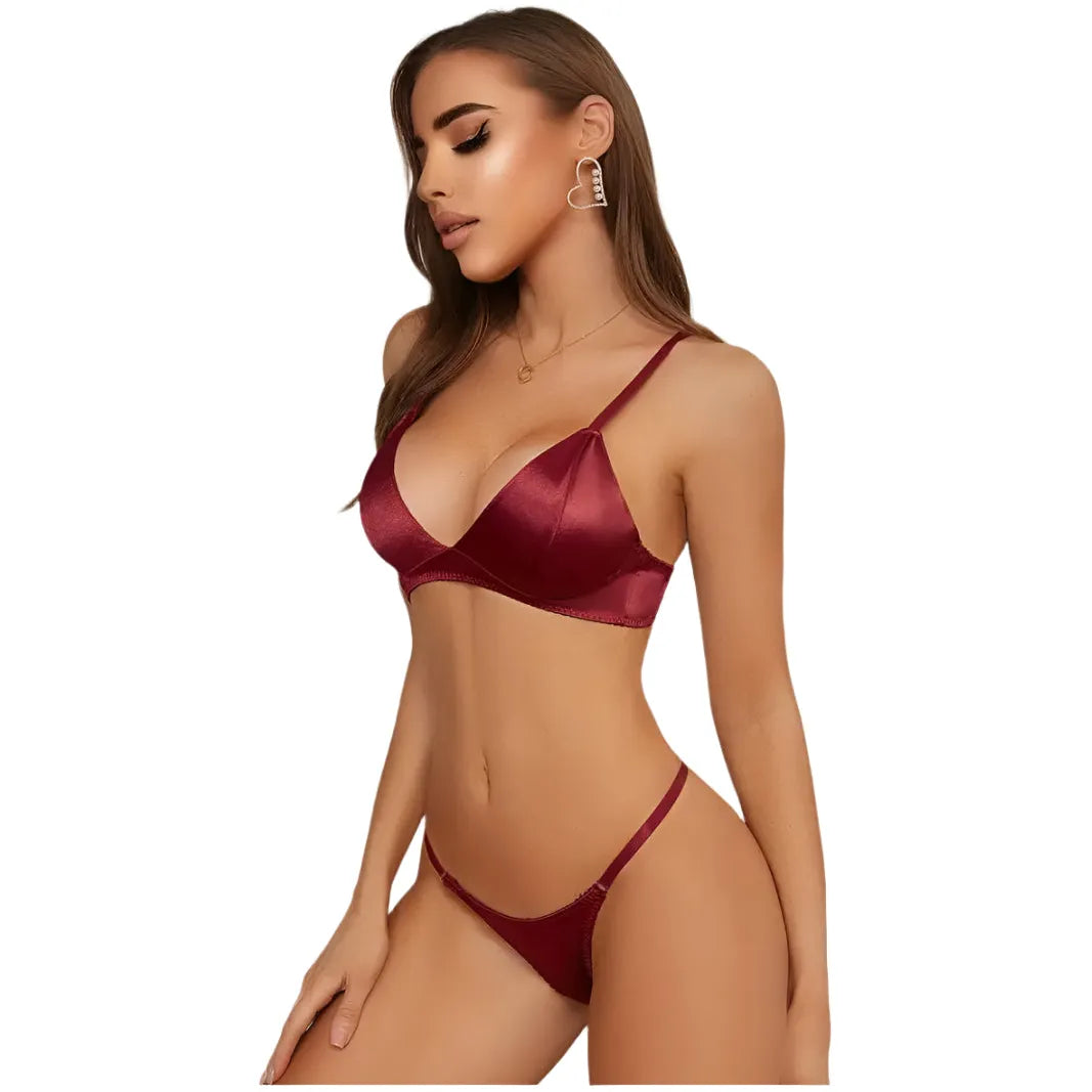 Turn up the heat with this sleek and sexy Red Wine satin bra and thong set. The triangle-shaped, non-padded bra offers light support with a seductive plunge. Paired with a matching thong, this set is smooth, sultry, and designed to make you feel effortlessly confident and irresistibly alluring.